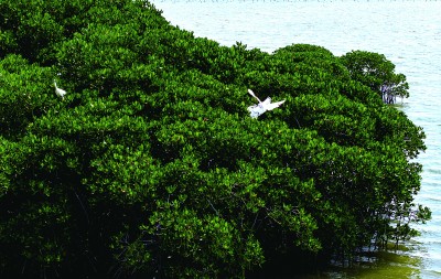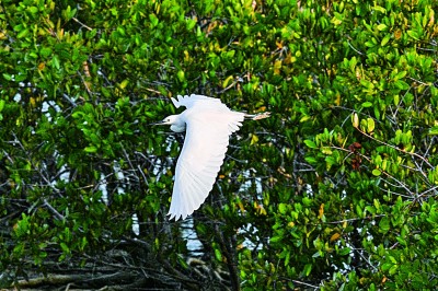 走进广东湛江金牛岛红树林,岛堰之间,高高低低的红树林成簇生长,树上白鹭翔集。往树下一瞧,水中竟鱼虾成群。