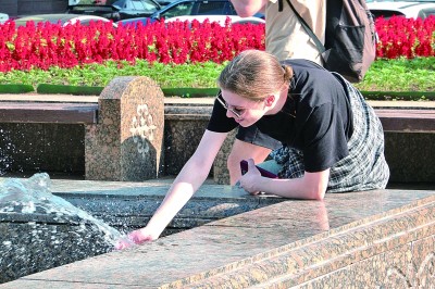 一名女性从喷泉中觅得一份清凉。