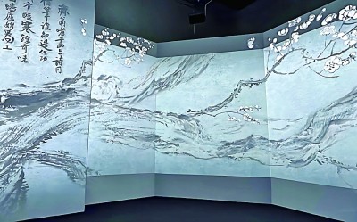 在当代语境下,水墨艺术的创新演绎并非简单延续传统技法,而是以现代材质与科技为媒介,重构其视觉语言,其核心在于中式元素与现代材质的巧妙融合。当传统水墨的意境与笔墨精神通过数字交互、光影装置、虚拟现实等新技术呈现,古典美学由此焕发新生。如湖南美术馆“北京画院藏齐白石精品展”的数字化展陈中,齐白石所绘鱼虾不再局限于传统纸本水墨,而是通过数字投影、动态AR技术在电子屏上自在游弋。借由虚实结合创意与裸眼3D效果,墨色随观众的互动产生晕染变幻,还原出水墨竹林的意境,既保留了白石老人“妙在似与不似之间”的写意精髓,又完美复现了传统水墨“偶然得之”的戏笔状态。“刘海粟美术馆建馆三十周年纪念展”尝试通过数字艺术创新展陈方式,在近50平方米的8k超高清大屏上,将《岁寒三友图》《粗枝大叶荷花》等水墨作品进行数字化解析与重构,营造出生机勃勃的动态光影效果。原作的遒劲笔触与随风轻颤的花枝在光影中交织,让观众身临其境般感受艺术与科技的完美融合。