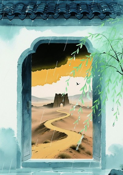 以客舍门廊为框,沙漠土路、沧桑城楼为背景,乌云与昏黄天色交织的压抑感中,飞鸟划破沉闷的画面。柳寓意“留”,门前挂满雨滴的青青柳枝与远处“西出阳关”的苍茫氛围相映衬,表达对友人远行的牵挂之情。