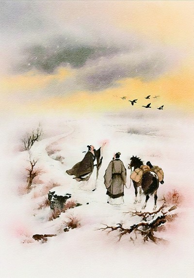 聚焦“北风吹雁雪纷纷”的苍茫感,一人仰天长啸、一人牵马而立,表现出离别的不舍与“莫愁前路无知己”的豁达。黄灰渐变的冷调天空、翱翔的飞鸟、水墨皴擦的雪地肌理与暖黄色光晕交织,营造出宏阔高远的气象。