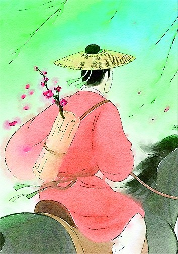 取意“折花逢驿使”,以橙红色衣装的驿使人物为主体,竹筒中所插红梅花瓣飘落的动态,呼应“聊赠一枝春”的浪漫。蓝绿水彩晕染的背景,表现出古诗中江南春信的灵秀与清新,传递“赠物寄情”的纯粹情感。