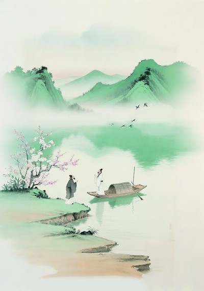 远山葱茏,江水无垠,岸边人与船上人挥手道别,远方的薄雾象征着不确定的将来。在通信渠道匮乏的年代,分离的意味更加浓郁,深千尺的桃花潭水静默无声,见证着这份深厚的情谊。淡彩水墨的晕染让画面充满古典意境。