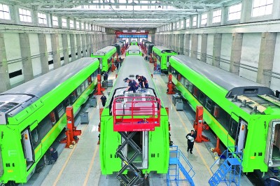 连日来,在中国铁路太原局集团有限公司太原车辆段,检修人员加紧对列车进行检修、维护、全方位排障,为即将到来的暑运做准备。图为6月17日,检修人员对列车进行检查维护。新华社记者 詹彦摄