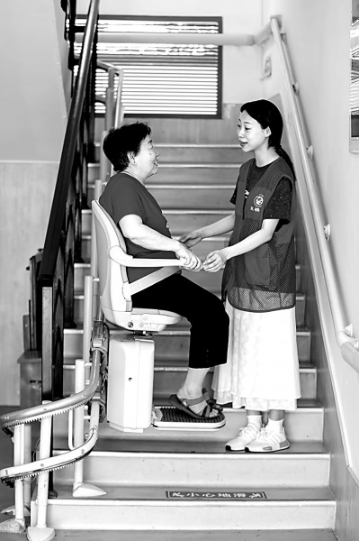 福建福州鼓楼区鼓东街道开元社区居家养老服务站内,志愿者正陪同老年人体验乘坐无障碍电梯。谢贵明摄/光明图片