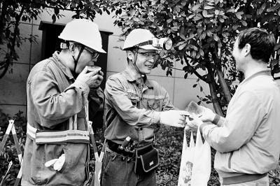 居民为国网绍兴市上虞区供电公司工作人员送西瓜解暑。严璐瑶摄/光明图片