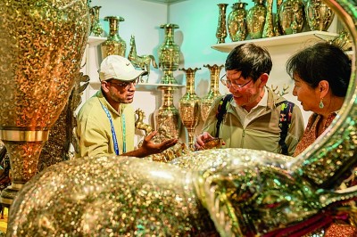 6月20日,顾客在第9届中国-南亚博览会南亚馆巴基斯坦展区选购铜制工艺品。新华社发