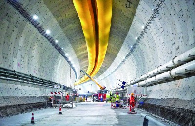 6月22日,山东省济南市黄岗路穿黄隧道顺利完成黄河段掘进任务,这一世界最大直径水下盾构隧道工程建设取得阶段性突破。济南市黄岗路穿黄隧道全长约5755米,其中盾构段长约3290米,盾构机开挖直径17.5米,是目前在建的世界最大直径水下盾构隧道。图为建设者在穿黄隧道内作业。 新华社记者 徐速绘摄