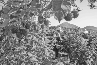 近日,河北省唐山市迁西县的树莓迎来收获季,农民们不误农时加紧采摘,并做好保鲜储存、销售工作。图为6月23日,迁西县兴城镇农民在树莓种植基地采摘树莓。