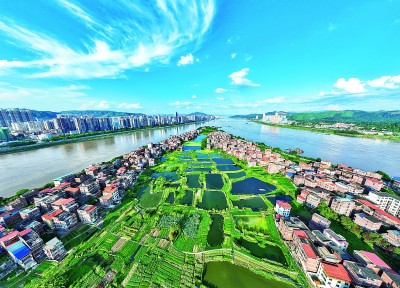 6月23日,广西梧州市长洲区长洲镇竹湾村,鱼塘与菜地、村居、河流、城市、蓝天白云等构成一幅和美的夏日乡村图景。林志清摄/光明图片