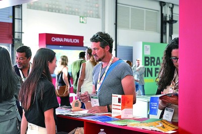 6月24日,在法国西部海滨城市拉罗谢尔,人们在第36届法国阳光国际纪录片节中国联合展台交流。新华社发