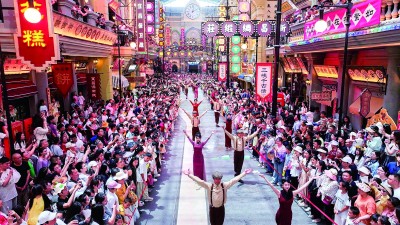 在景区,留住游客的不只是舞台上“文化味”十足的演出,更有特色主题街区“一步一景”的惊喜——灵动的宜都“合江楼”跃然而出;木版年画铺前,孩童拓印的三国英雄栩栩如生;“诸葛亮”羽扇轻摇,与游客亲切互动……一个个鲜活的互动节目,让游客踏上了深度感受文化魅力的旅程。