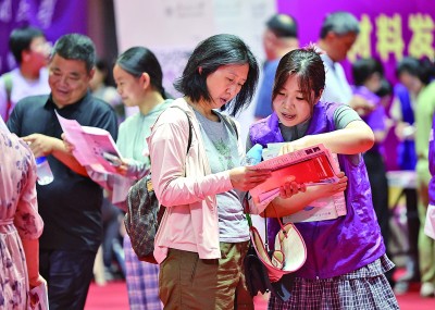 6月25日,南开大学举行校园开放日和高招咨询,为考生和家长提供报考指导,现场共有20余所高校参加。图为高校工作人员为家长讲解招生政策。刘东岳摄/光明图片