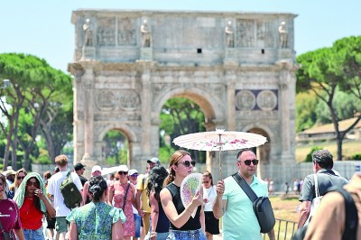 6月27日,意大利卫生部高温预警公告显示,6月27日至29日,全国主要城市将迎来大范围高温天气,包括罗马、米兰、佛罗伦萨、威尼斯在内的12个城市发布连续三日高温红色预警。图为在意大利罗马,游客在君士坦丁凯旋门游览。新华社发
