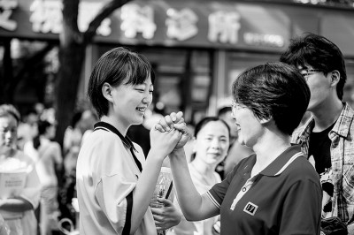 6月21日,河北省邯郸市第十中学中考考点,一位考生与送考老师击掌加油。聂长青摄/光明图片