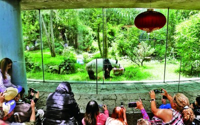 游客为大熊猫“欣欣”拍照。