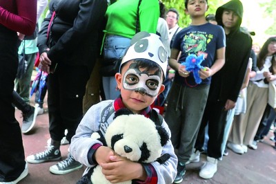 当地少年抱着大熊猫玩偶参加庆祝活动。