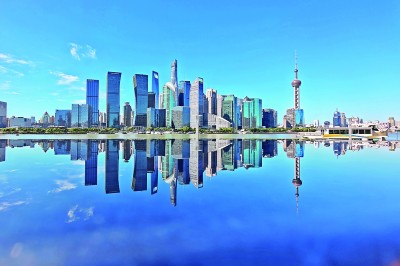 7月1日,在上海市虹口区北外滩国航段观景平台拍摄的陆家嘴“天空之镜”景观。该观景平台安装了4款不同颜色的金属反光镜面,方便摄影爱好者拍摄出陆家嘴实景与倒影同框的景象。王冈摄/光明图片