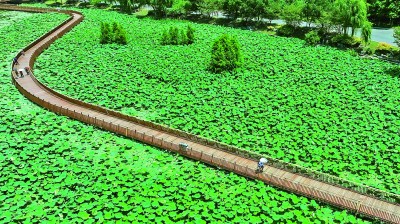 7月1日,江苏南京玄武湖公园内的荷叶渐密,吸引市民游客前来漫步休闲,临水赏荷。新华社记者 李博摄