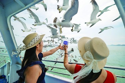 山东省荣成市素有“中国黑尾鸥之乡”的美誉,每年3月至8月中旬,数万只黑尾鸥会来此筑巢、产卵、繁衍生息。6月30日,在海驴岛海域一艘游船上,游客与黑尾鸥互动,在碧海蓝天间感受生物多样性之美。李信君摄/光明图片
