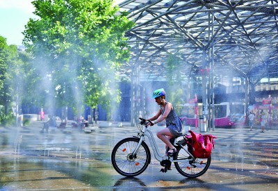 近日,奥地利首都维也纳持续高温。图为7月3日,一名女子骑车经过维也纳市区一处喷泉装置。新华社发