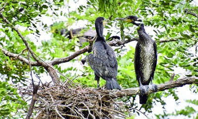 近日,北京市密云水库鸟岛的幼鸟陆续离巢飞翔。据密云水库管理处水生态所管护员观测,鸟岛上的苍鹭、鸬鹚、白鹭等种群繁殖数量稳定,孵化的幼鸟在成鸟精心哺育下,近日陆续进行试飞活动。图为7月2日在密云水库鸟岛拍摄的小鸬鹚。新华社记者 李欣摄