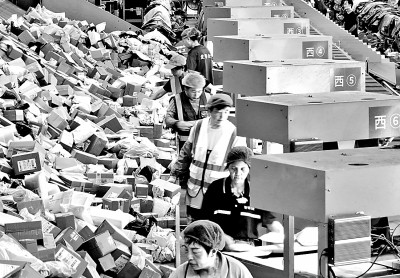 某快递企业邮件处理中心工作人员在分拣快递。新华社发
