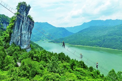 近年来,湖北省恩施土家族苗族自治州充分依托山水资源,打造了漂流、攀岩、绳降、皮划艇、桨板等体育运动基地,并通过引进体育赛事和团队集训,使体育产业与乡村旅游深度融合,有力助推了乡村振兴。图为7月8日,在湖北省恩施市新塘乡红花峰林景区,游客在体验“天梯”项目。新华社记者 伍志尊摄