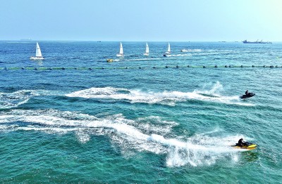 为迎接中国航海日,山东省青岛市举行“我们来航海”海上巡游活动。市民和游客受邀乘坐帆船、游艇出海,感受海洋文化的魅力。2025年是中国航海日设立20周年,今年航海日活动以“绿色航海 向新图强”为主题。图为7月10日,在青岛老龙湾海域,摩托艇参加海上巡游活动。新华社记者 李紫恒摄
