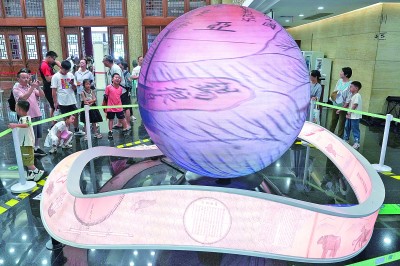 7月10日,南京博物院“观天下·坤舆万国全图”VR大空间沉浸展正式开展。展览以南京博物院明代中文版世界地图《坤舆万国全图》为主线,通过720°全景沉浸式、4K超清画质、大空间交互的VR数字形式,故事化、视觉化、沉浸式呈现明代历史背景下的水韵江苏、中西交流,吸引众多观众前来参观。图为观众在南京博物院观看展览的球形视频介绍。 新华社记者 李博摄