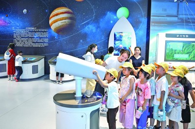 7月9日,宁夏科技馆航天科普展迎来参观热潮,不少小朋友前来了解航天知识,感受航天魅力,丰富假期生活。袁宏彦摄/光明图片