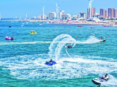 眼下,我国多地持续高温,酷暑热浪催热“清凉经济”。图为7月12日,在山东省荣成市那香海景区,游客享受海上旅游项目带来的清凉与欢乐。新华社发