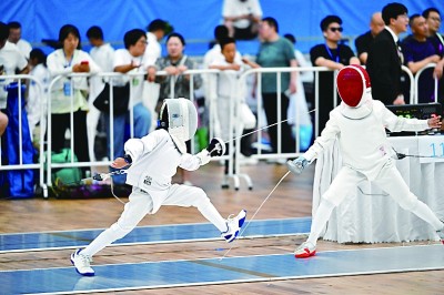 7月12日,2025年辽宁省青少年击剑冠军系列赛(第二站)在大连市中山区MOMO文化体育公园举行。此次击剑比赛吸引省内青少年击剑精英积极参与。赛事分为U8、U10、U12、U14、U16及U17六个组别,涵盖男子、女子花剑、佩剑、重剑多个剑种。图为选手在比赛中。赵敬东摄/光明图片