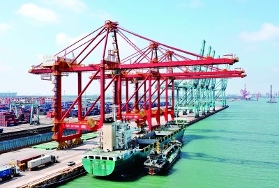 2025年上半年,河北黄骅港吞吐量稳中有增,完成货物吞吐量超1.79亿吨。图为7月16日,一艘轮船靠泊在黄骅港综合港区集装箱码头装货。新华社记者 杨世尧摄