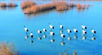 黄河三角洲国家级自然保护区内,鹤群悠然涉水而行。张晓龙摄/光明图片