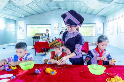广西百色市右江区迎龙第三小学学生在制作麽乜。梁卓豪摄