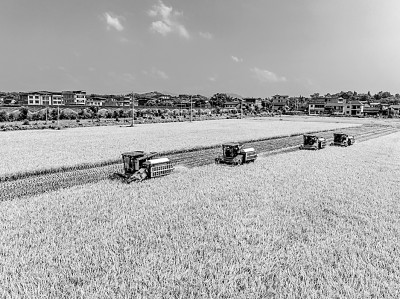 时下,湖南省永州市东安县数万亩高标准农田迎来丰收季,农民抢抓农时收割早稻,田间地头一派忙碌的劳动景象。图为7月19日,东安县芦洪市镇西江桥村高标准农田里,农民驾驶农机抢收早稻。蔡小平摄/光明图片