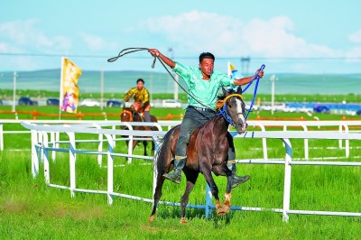 7月20日,内蒙古自治区第35届草原那达慕“男儿三艺”比赛在内蒙古锡林郭勒盟锡林浩特市举行。“男儿三艺”包括赛马、搏克和射箭,是每年那达慕上的固定比赛项目。图为选手们在速度赛马5000米比赛中。新华社记者 马金瑞摄