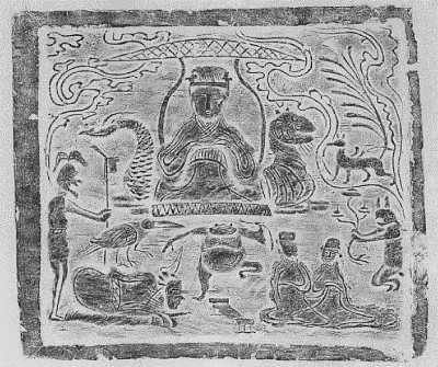 东汉铜镜与画像砖中,芝草和与昆仑关系密切的西王母组合出现:1986年安徽六安先王店乡出土一面东汉铜镜,内区主纹包括东王父、西王母、侍者、马、车、瑞兽、禽鸟等,外有铭文一周:“尚方作竟(镜)佳且好,左有王父坐行道,右有王母,白而芝草方其后,令人富贵不老,子孙满室世。”(见图①,采自《六安出土铜镜》)