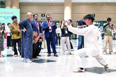 7月23日至27日,上海合作组织媒体智库峰会在河南郑州举行。来自上合组织26个国家的156家主流媒体、知名智库、政府机构以及联合国、上合组织秘书处等国际和地区组织的400多名代表参会。图为7月24日,与会代表在会场观看太极拳表演。新华社发