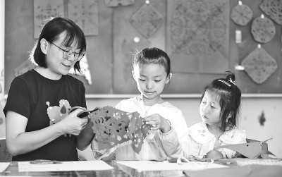暑假以来,贵州省黔西市文峰街道爱心暑托班开设非遗剪纸课程,让孩子们近距离体验剪纸艺术的魅力。图为7月24日,大学生志愿者在指导孩子们学习剪纸。周训超摄/光明图片