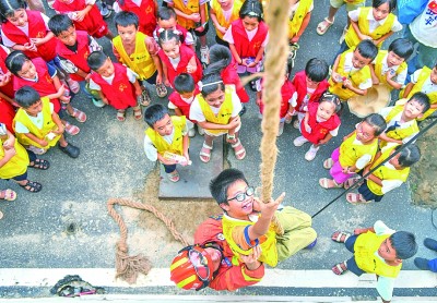 7月25日,湖南省永州市道县消防救援大队开展“暑期消防安全体验营”活动,孩子们在消防救援人员的带领下,通过学习消防知识、体验消防装备操作使用和绳索攀爬技能等项目,提高消防安全意识和自救能力。图为孩子们在消防救援人员的协助下学习绳索攀爬技能。蒋克青摄/光明图片