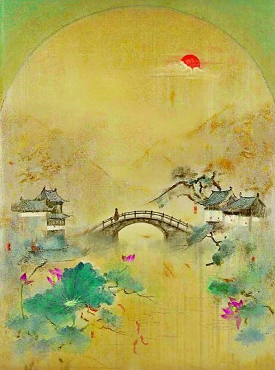 红日初升,映照着远处的山峦,湖面上莲叶田田。画面色调古朴淡雅,整体营造出送别时既清新又略带惆怅的氛围。
