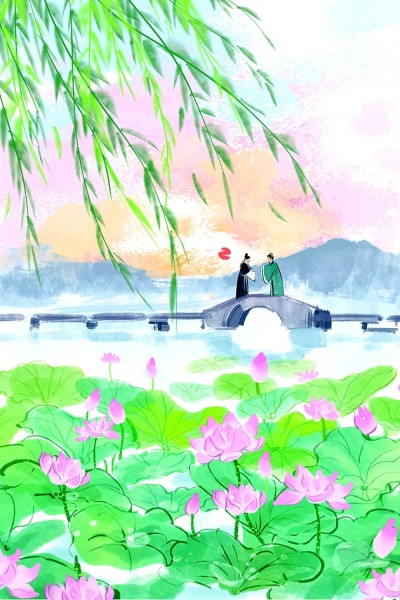 清晨的西湖湖畔,荷花与柳叶在朝阳的映照下于微风中轻轻摇晃,林子方与友人杨万里在小桥之上依依惜别。
