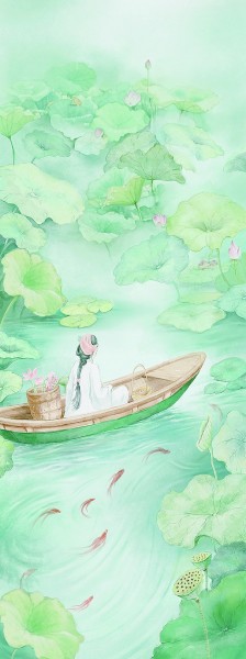 荷叶亭亭玉立,莲花朵朵绽放,游鱼在水中嬉戏。小舟轻泛,衣袂素淡的采莲人静坐其间,似与莲荷、游鱼共融,让观者感受到江南水乡的温婉诗意。