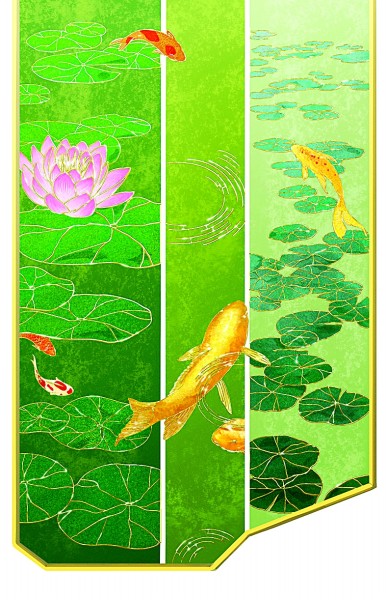 将掐丝珐琅的视觉效果以平面插画的形式表现出来,让鱼儿在荷叶间嬉戏的一幕跃然纸上,展现出水乡荷韵的美好恬静。