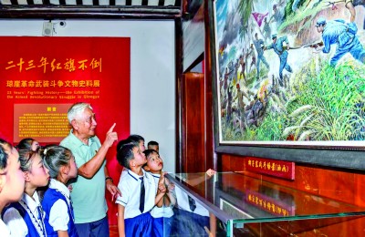 海南海口中共琼崖一大旧址,学生们正在听琼崖革命故事。康登淋摄/光明图片