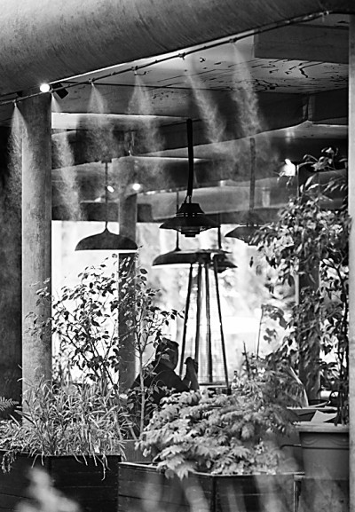 近日,哈萨克斯坦南部遭遇高温天气,部分地区气温超过40摄氏度。图为7月27日,哈萨克斯坦阿拉木图市的餐厅启用喷雾降温装置。新华社发