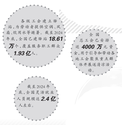 同时,各地的企事业单位也陆续加入与工会合作建设驿站的队伍中,由各地工会、银行、电信营业网点、加油站、中介等单位建立的大大小小的服务站点,为包括新就业形态劳动者群体在内的户外劳动者支起了一顶顶全社会参与的、饱含温情的“遮阳伞”。