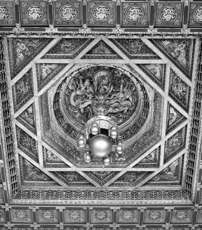 太和殿内宝座上方有蟠龙藻井,全称为“龙凤角蝉云龙随瓣枋套方八角浑金蟠龙”藻井。其中,“角蝉”是指藻井中的三角形或菱形区域。此藻井的主要功能,是象征皇权的威严及皇帝的正统性。藻井顶部中心,有口含轩辕镜的蟠龙造型,辅以如意云纹饰。此蟠龙身体盘曲,曲颈挺胸,双目圆瞪,触须横伸,张牙舞爪,气势磅礴,呼之欲出,极具威严和震慑之感。从雕刻技法角度而言,蟠龙造型采用了多层镂雕(全方位雕刻,如龙头)、透雕(正面或正反两面雕刻,如龙须)、浮雕(平面上雕出凸起的艺术形象,如龙身)、阴刻(将图案刻成凹形,如龙鳞)等雕刻技法。其手法精美绝伦,线条细腻流畅,工艺精湛大气,纹饰疏密有致,繁而不乱,变化中显统一,尽显奢华之美,体现了我国古代工匠精湛的雕刻技艺。